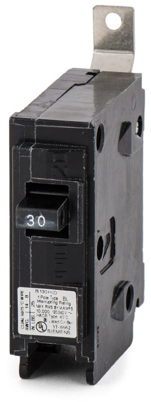 The Siemens B130HID is a 1 Pole thermal magnetic molded case circuit breaker with a current rating of 30 Amps and a voltage rating of 120VAC. It has an interrupting rating of 10kAIC at 120V. The B130HID has a bolt-on connection type and includes long time and instantaneous trip functions.