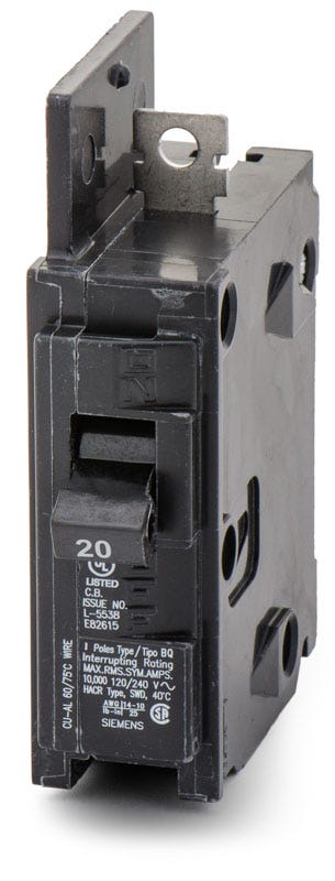 The Siemens BQ1B020H is a 1 Pole thermal magnetic molded case circuit breaker with a current rating of 20 Amps and a voltage rating of 120VAC. It has an interrupting rating of 22kAIC at 120VAC. The BQ1B020H has a bolt-on connection type and includes long time and instantaneous trip functions.