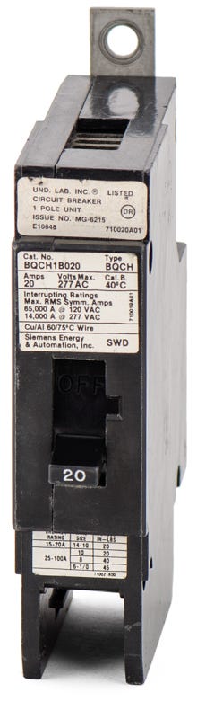 The Siemens BQCH1B020 is a 1 Pole thermal magnetic molded case circuit breaker with a current rating of 20 Amps and a voltage rating of 277/480V. It has an interrupting rating of 14kAIC at 480V. The BQCH1B020 has a bolt-on connection type and includes long time and instantaneous trip functions.