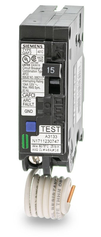 The Siemens QA115AF 1 Pole Arc Fault Circuit Breaker is designed for general industrial use such as branch circuit protection. This CSA certified unit is a thermal/magnetic overcurrent protection device which provides arc protection and prevents the onset of fire due to faulty connections. This AFCI (Arc Fault Circuit Interrupter) can identify electrical arcing conditions that may eventually cause fire and cuts off the electrical supply to prevent damage. The QA115AF is designed for 1-phase circuits and made for use with Siemens single phase load centers. This circuit breaker has voltage current and interrupting ratings of 120 VAC 15 Amp and 10 kAIC respectively. It has the following dimensions: Length 4.33" Width 1.18" and Depth 3.15".