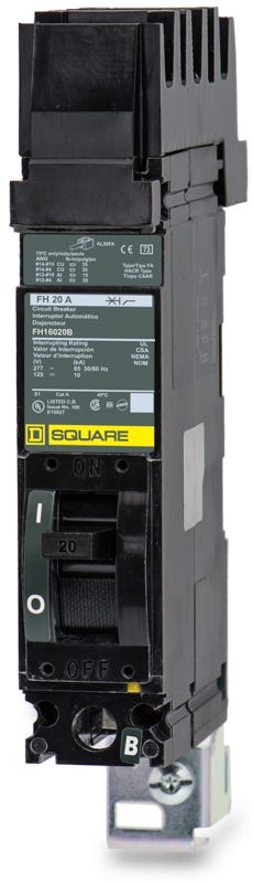 The Square D FH16020B is a 1 Pole thermal magnetic molded case circuit breaker with a current rating of 20 Amps and a voltage rating of 277VAC. It has an interrupting rating of 25kAIC at 240V. The FH16020B has an I-Line style plug-in connection type and includes long time and instantaneous trip functions.