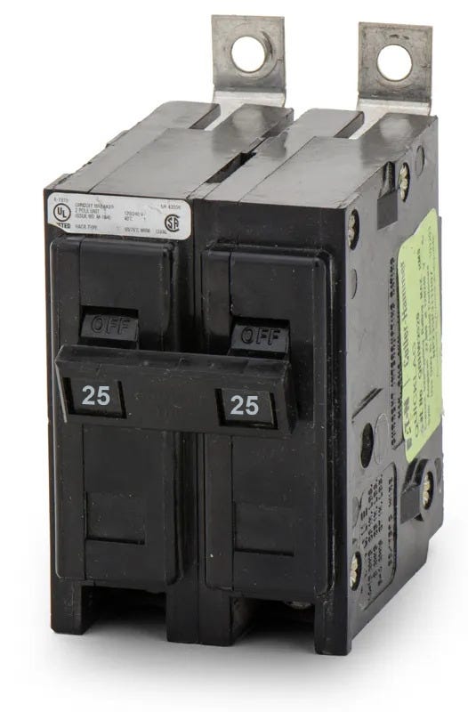 The Eaton QBHW2025 is a 2 Pole thermal magnetic molded case circuit breaker with a current rating of 25 Amps and a voltage rating of 120/240VAC. It has an interrupting rating of 22kAIC@240V. The QBHW2025 has a panel mounting type and includes long time and instantaneous trip functions.