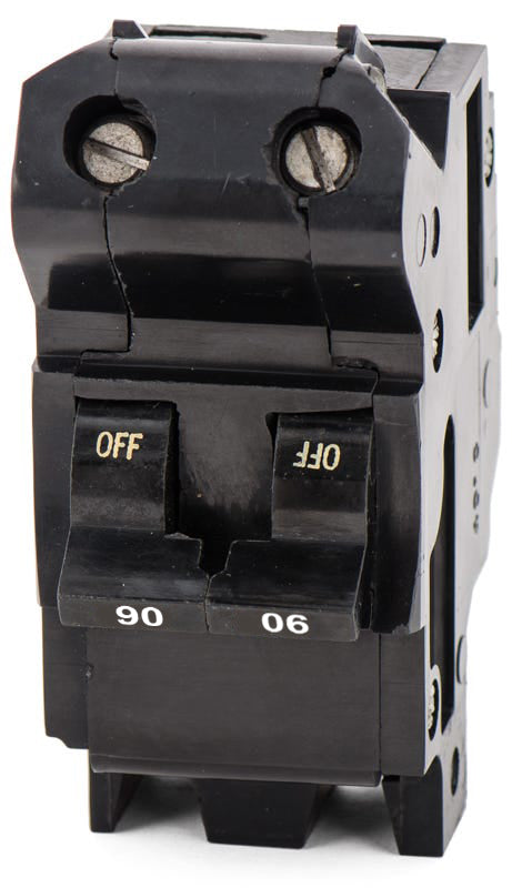 The Federal Pacific NB90 is a 2 Pole thermal magnetic molded case circuit breaker with a current rating of 90 Amps and a voltage rating of 240V. It has an interrupting rating of 10kAIC at 240V. The NB90 has a bolt-on connection type and includes LI - long-time and instantaneous functions.