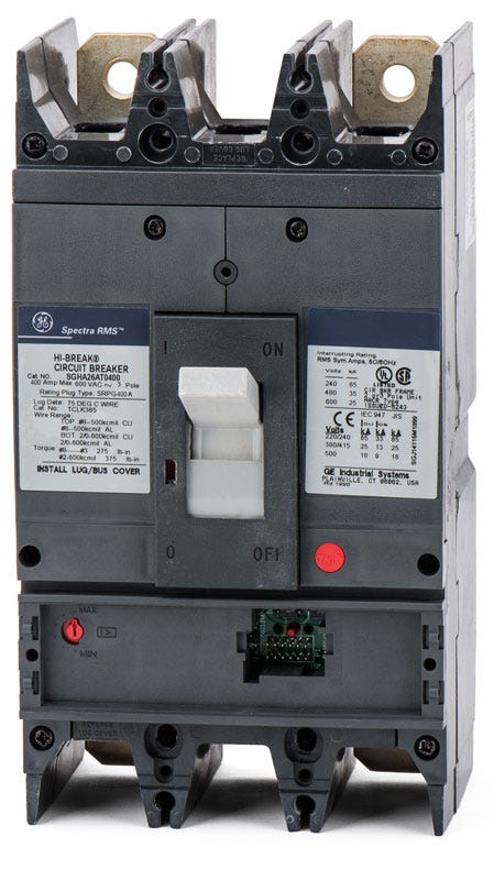 The General Electric SGHA26AT0400 is a 2 Pole solid state molded case circuit breaker with a current rating of 400 Amps and a voltage rating of 600VAC. It has an interrupting rating of 35kAIC at 480V. The SGHA26AT0400 has a bolt-on connection type and includes long-time, short-time and instantaneous trip functions.