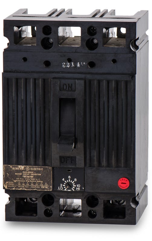 The General Electric TEC26100 is a 2 Pole magnetic molded case circuit breaker with a current rating of 100 Amps and a voltage rating of 600V. It has an interrupting rating of 10kAIC at 480V. The TEC26100 has a feed-thru connection type and includes I - instantaneous trip functions.