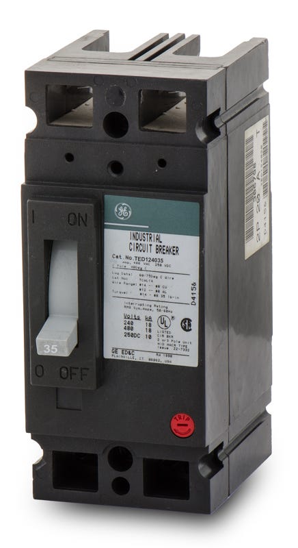 The General Electric TED124035 is a 2 Pole thermal magnetic molded case circuit breaker with a current rating of 35 Amps and a voltage rating of 480VAC. It has an interrupting rating of 18kAIC at 480V. The TED124035 has a bolt-on connection type and includes LI - long-time and instantaneous trip functions.
