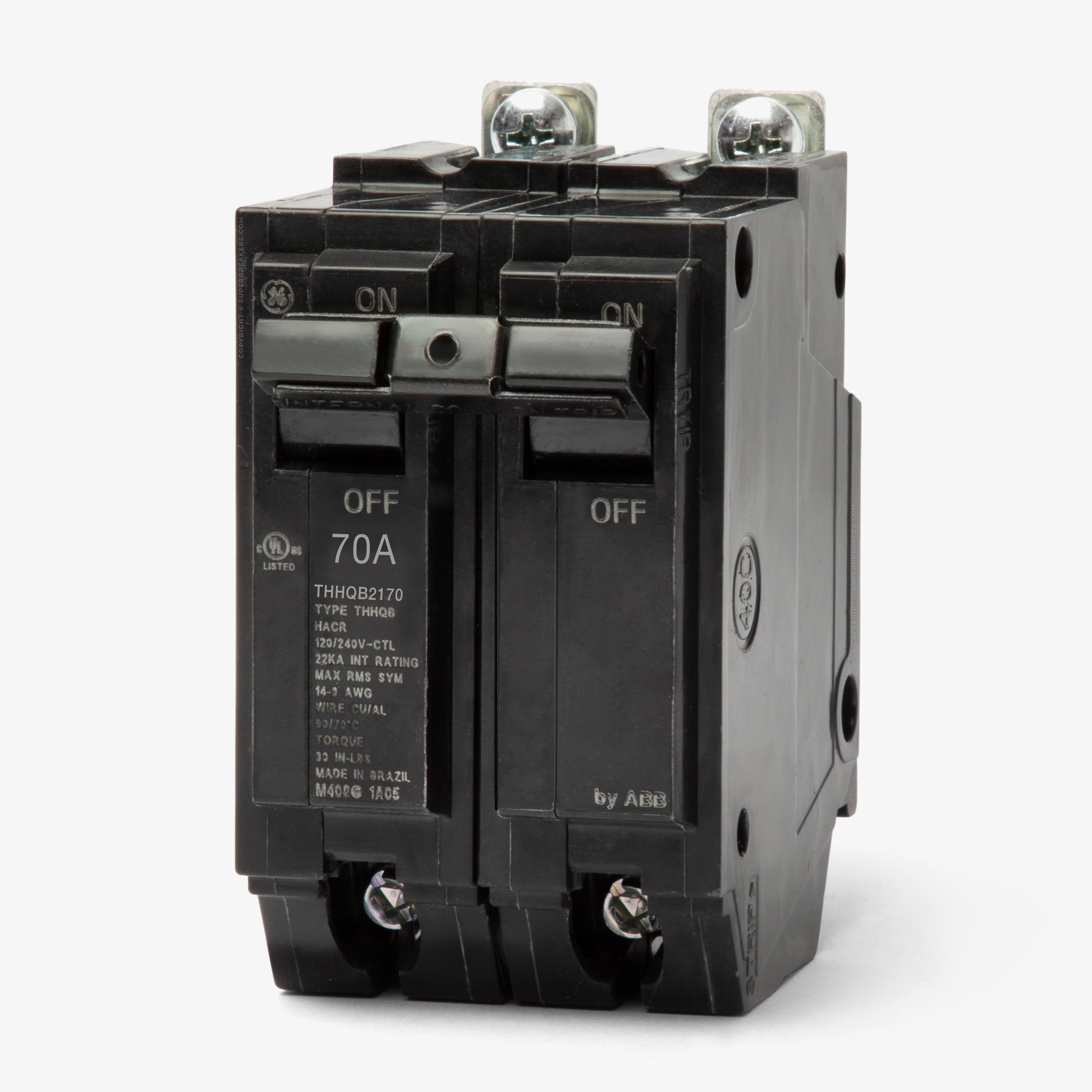 The General Electric THHQB2170 is a 2 Pole thermal magnetic molded case circuit breaker with a current rating of 70 Amps and a voltage rating of 240VAC. It has an interrupting rating of 22kAIC at 240V. The THHQB2170 has a bolt-on connection type and includes long time and instantaneous trip functions.