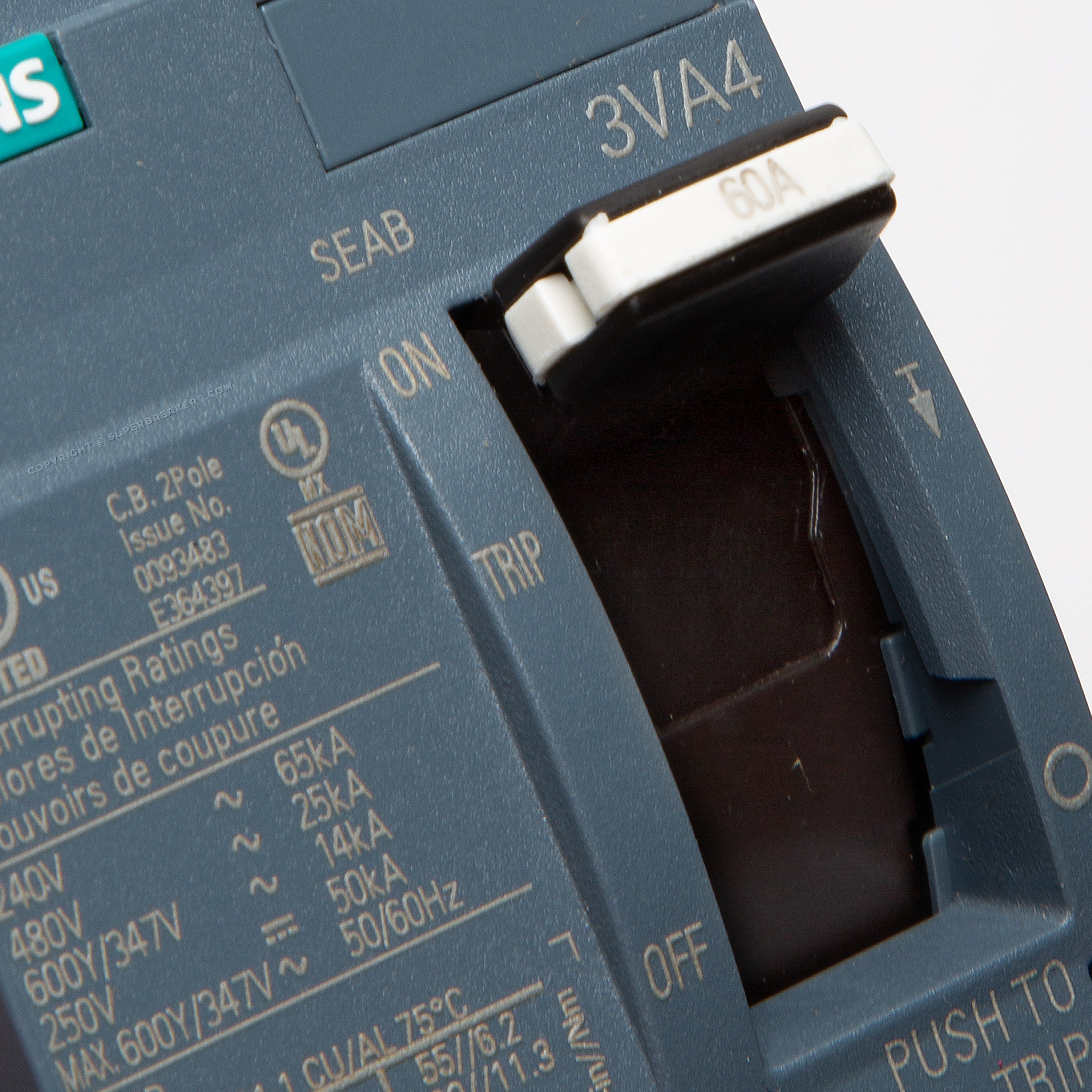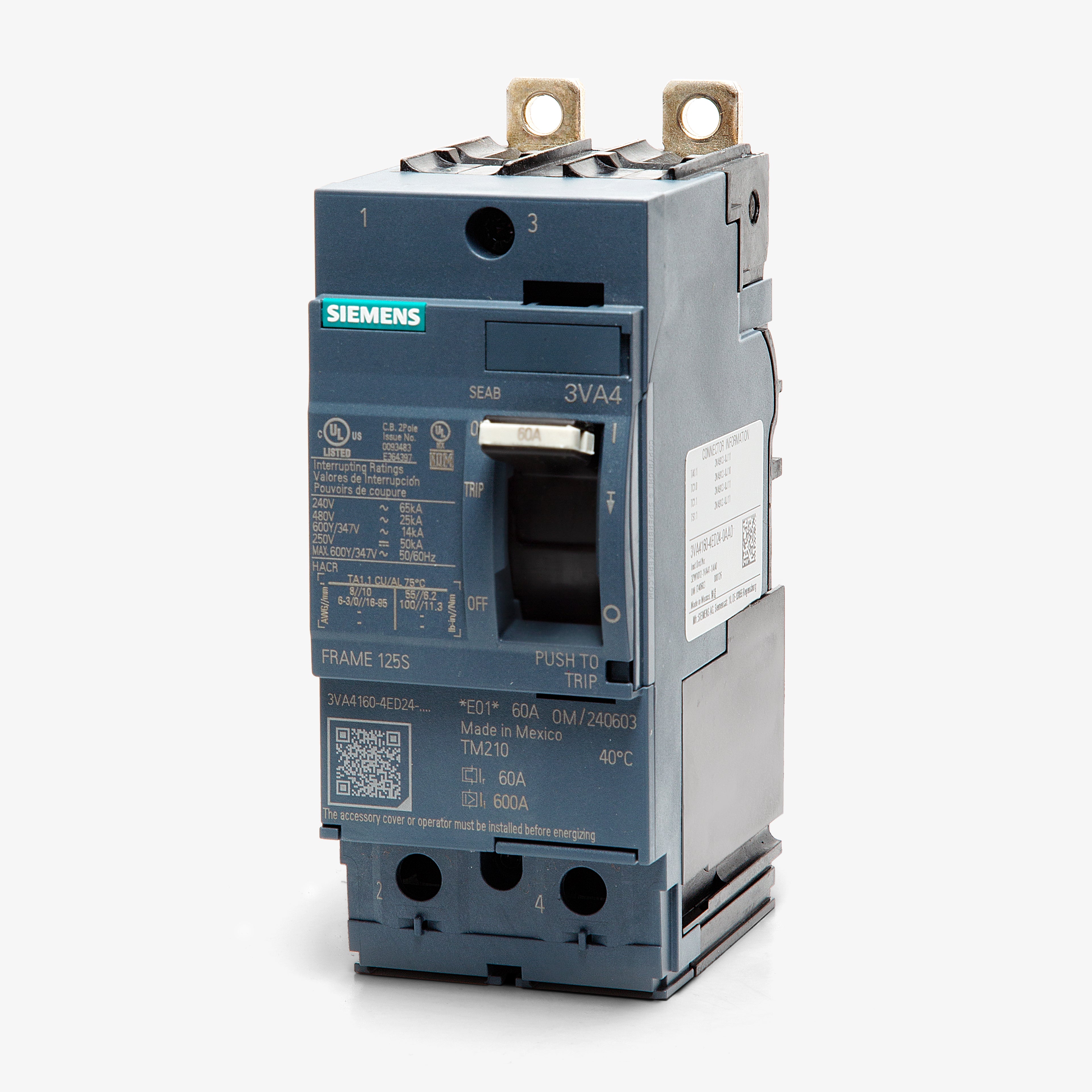 The Siemens 3VA4160-4ED24-0AA0 is a 2 Pole thermal magnetic molded case circuit breaker with a current rating of 60 Amps and a voltage rating of 600Y/347V. It has an interrupting rating of 14kAIC at 600Y/347V, 25kAIC at 480V. The 3VA4160-4ED24-0AA0 features with a 3VA41 frame type.
