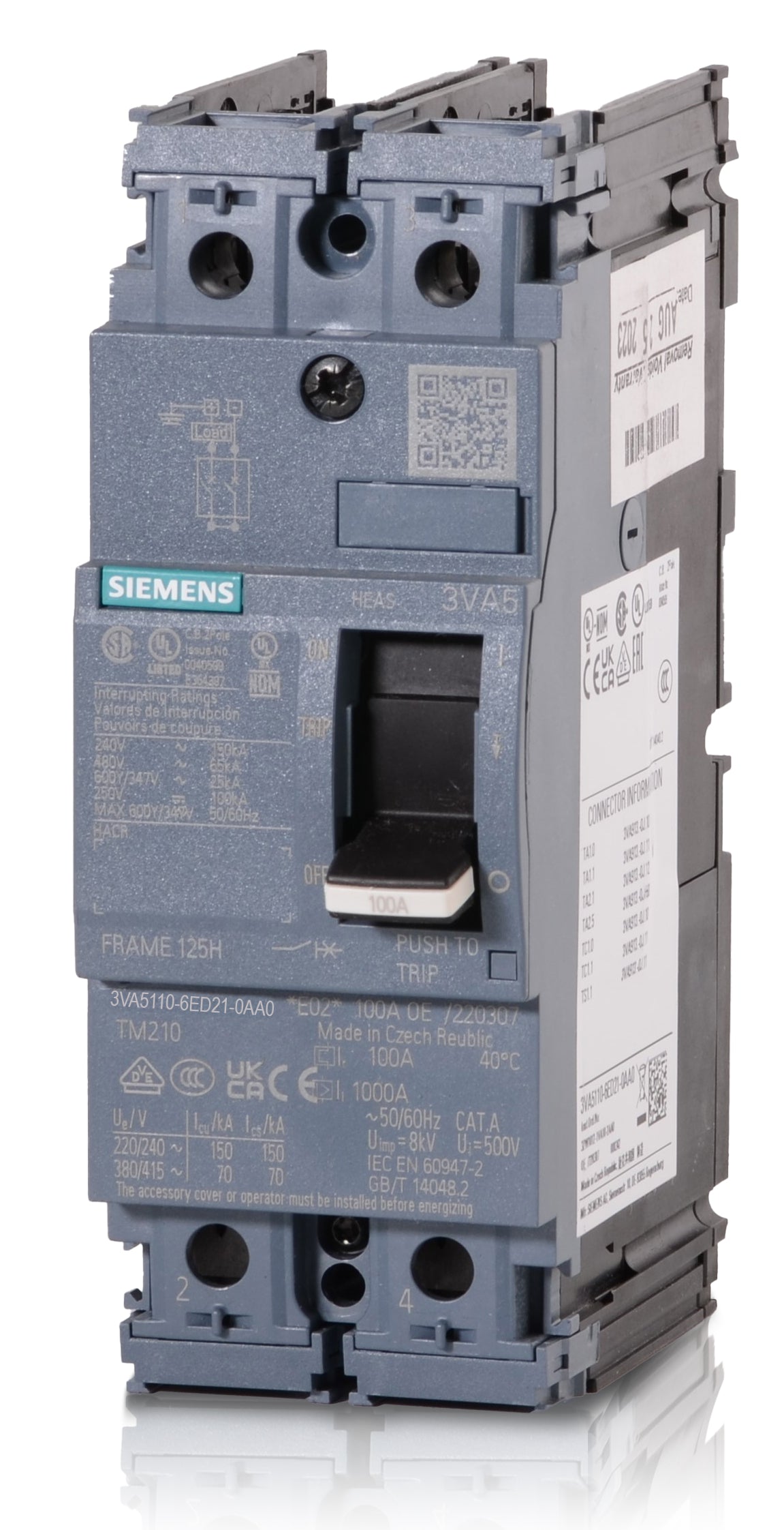The Siemens 3VA5110-6ED21-0AA0 is a 2 Pole molded case circuit breaker with a current rating of 100 Amps and a voltage rating of 480V. It has an interrupting rating of 65kA@480V.