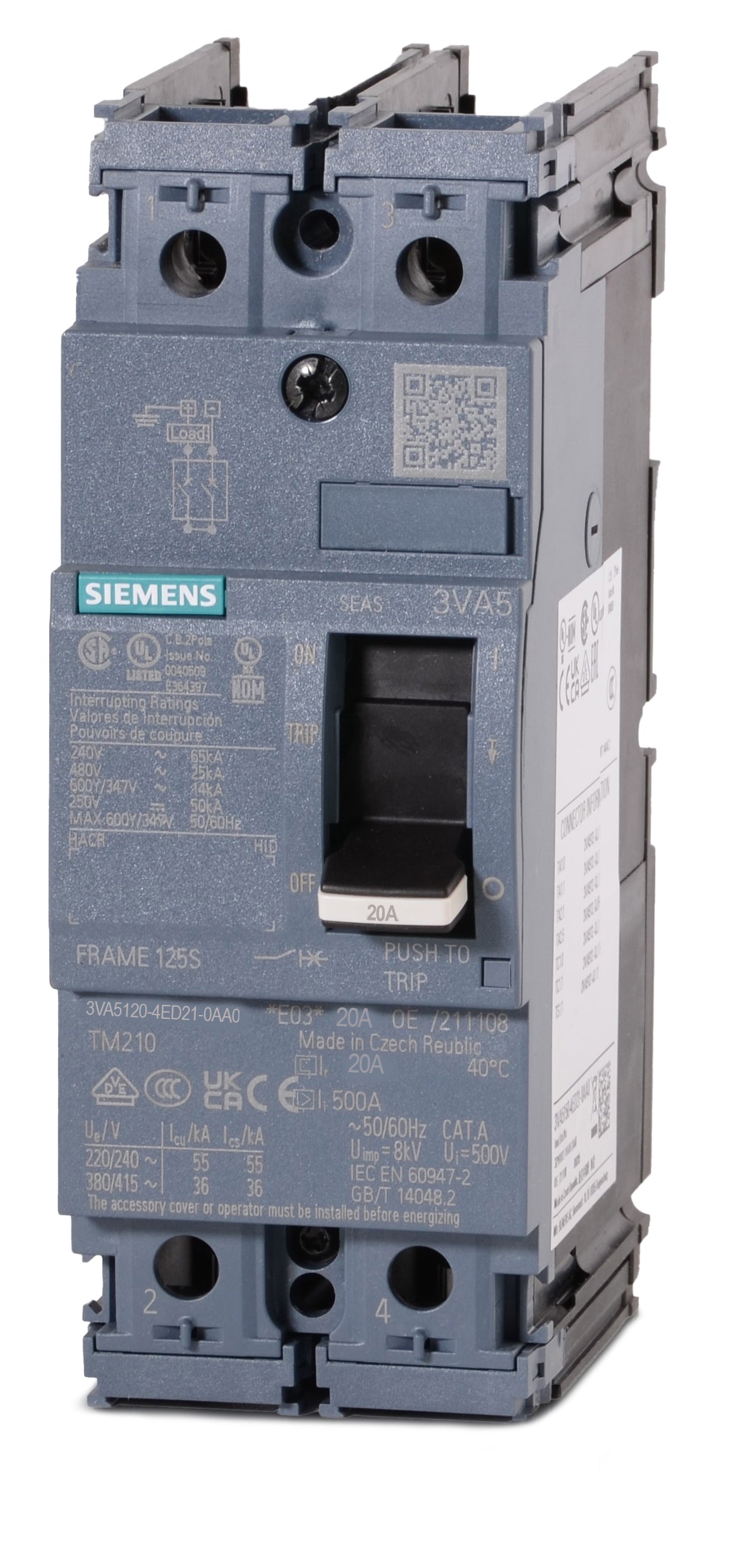 The Siemens 3VA5120-4ED21-0AA0 is a 2 Pole molded case circuit breaker with a current rating of 20 Amps and a voltage rating of 480V. It has an interrupting rating of 25kA@480V.