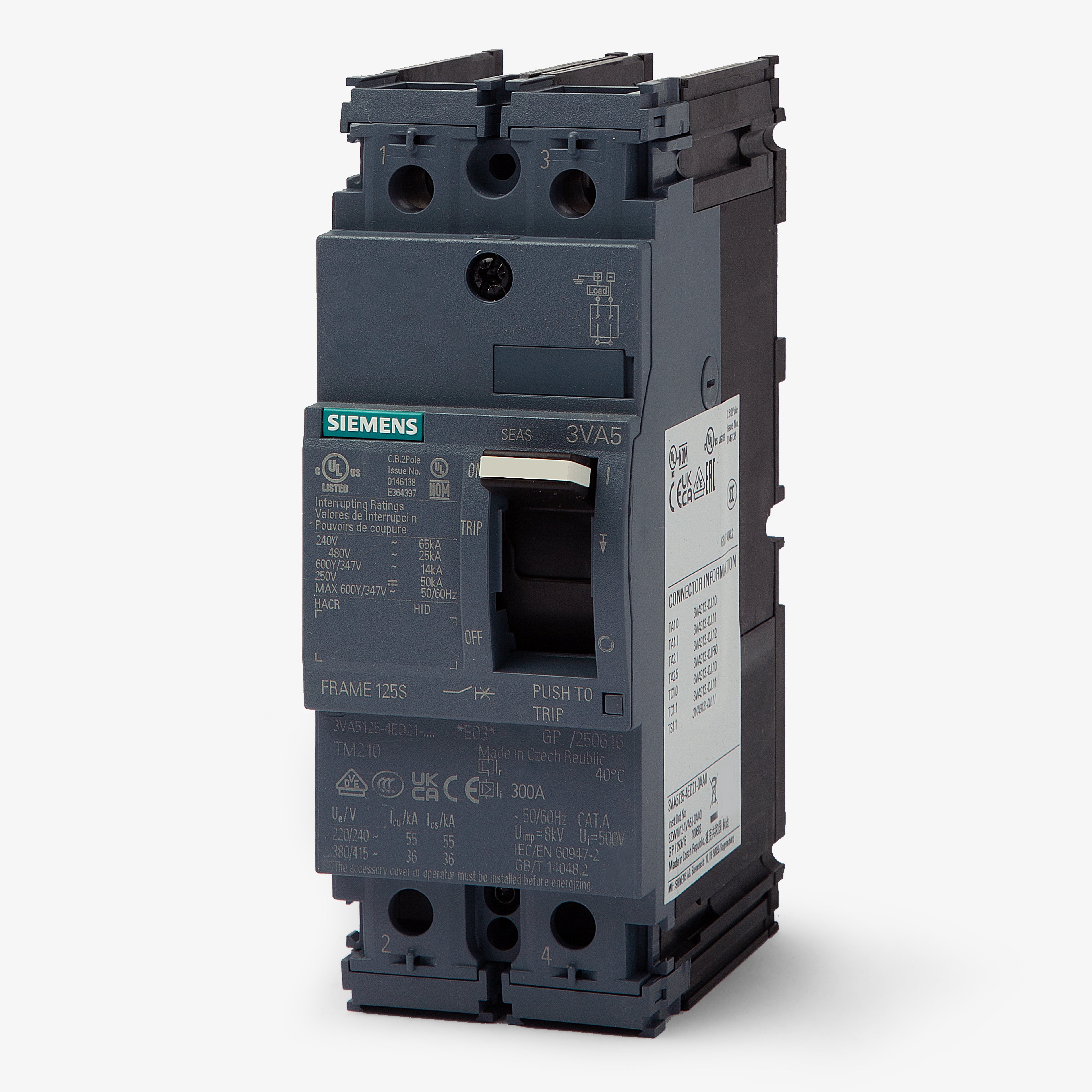 The Siemens 3VA5130-4ED21-0AA0 is a 2 Pole molded case circuit breaker with a current rating of 30 Amps and a voltage rating of 480V. It has an interrupting rating of 25kA@480V.