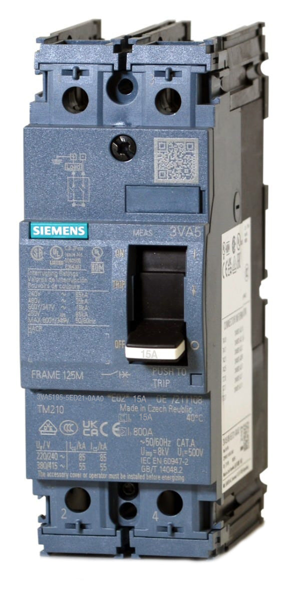 The Siemens 3VA5195-5ED21-0AA0 is a 2 Pole molded case circuit breaker with a current rating of 15 Amps and a voltage rating of 480V. It has an interrupting rating of 35kA@480V.