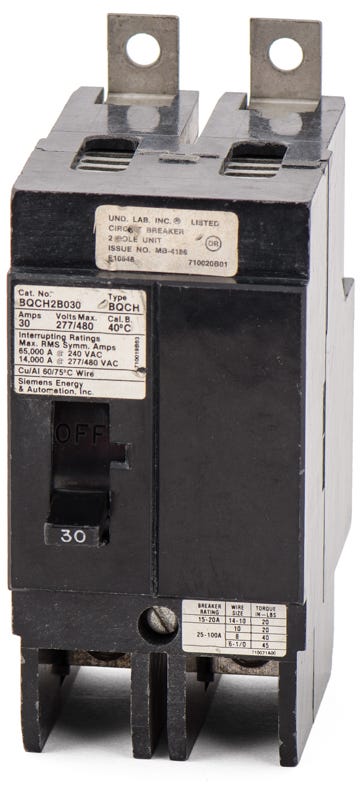 The Siemens BQCH2B030 is a 2 Pole thermal magnetic molded case circuit breaker with a current rating of 30 Amps and a voltage rating of 277/480V. It has an interrupting rating of 14kAIC at 480V. The BQCH2B030 has a bolt-on connection type and includes long time and instantaneous trip functions.