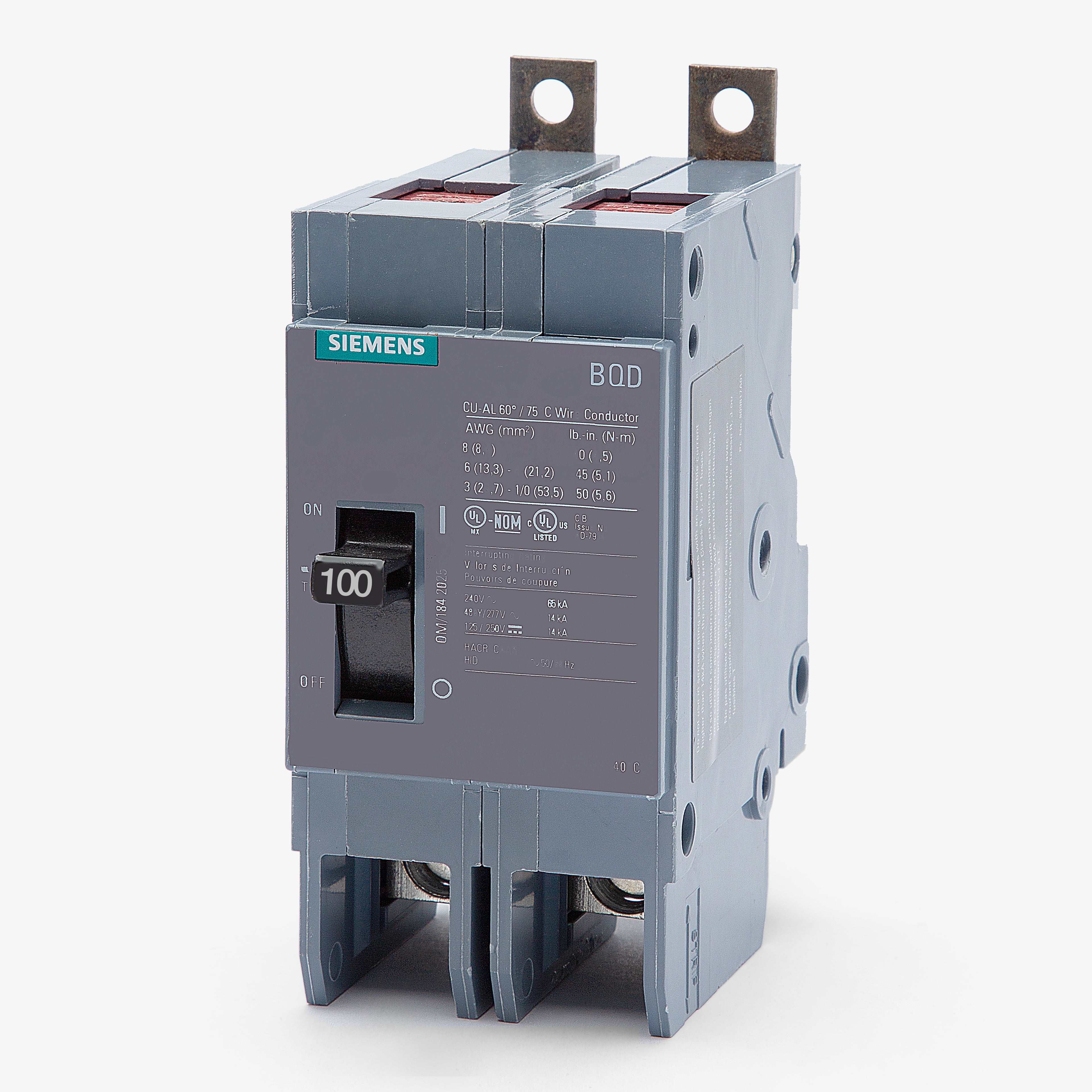 Engineered for industrial environments, the Siemens BQD2100 is a 100-amp, two-pole MCCB delivering dependable thermal-magnetic overcurrent protection. It features a quick-make, quick-break mechanism to ensure reliable operation. Designed with a low-tab bolt-on connection, this breaker integrates seamlessly into Siemens P1 through P5 series panelboards. With an interrupting capacity of 65kA at 240V and 14kA at 480Y/277V, it is HACR rated and comes equipped with standard load-side lugs.