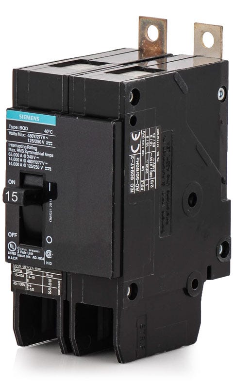 The Siemens BQD215 is a 2 Pole thermal magnetic molded case circuit breaker with a current rating of 15 Amps and a voltage rating of 480VAC, 125/250VDC. It has an interrupting rating of 14kAIC at 480VAC. The BQD215 has a bolt-on connection type and includes long time and instantaneous trip functions.