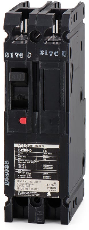 The Siemens E42B040 is a 2 Pole thermal magnetic molded case circuit breaker with a current rating of 40 Amps and a voltage rating of 480VAC. It has an interrupting rating of 18kAIC at 480V. The E42B040 has a bolt-on connection type and includes long time and instantaneous trip functions.