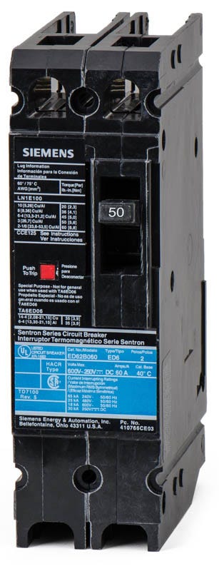 The Siemens ED62B050L is a 2 Pole thermal magnetic molded case circuit breaker with a current rating of 50 Amps and a voltage rating of 600V. It has an interrupting rating of 25kAIC at 480V. The ED62B050L has a feed-thru connection type and includes long time and instantaneous trip functions.