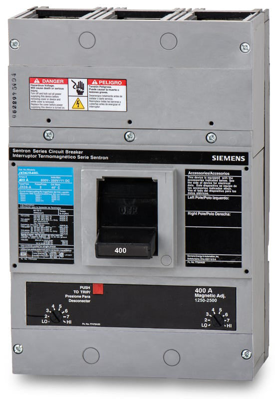 The Siemens JXD62B400L is a 2 Pole thermal magnetic molded case circuit breaker with a current rating of 400 Amps and a voltage rating of 600V. It has an interrupting rating of 35kAIC at 480V. The JXD62B400L has a feed-thru connection type and includes LI - long-time and instantaneous trip functions.