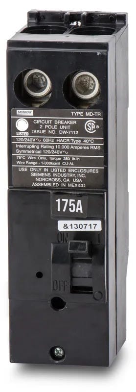 The Siemens MPD2175R is a 2 Pole thermal magnetic molded case circuit breaker with a current rating of 175 Amps and a voltage rating of 120/240VAC. It has an interrupting rating of 22kA. The MPD2175R has a plug-on connection type and includes long time and instantaneous trip functions.