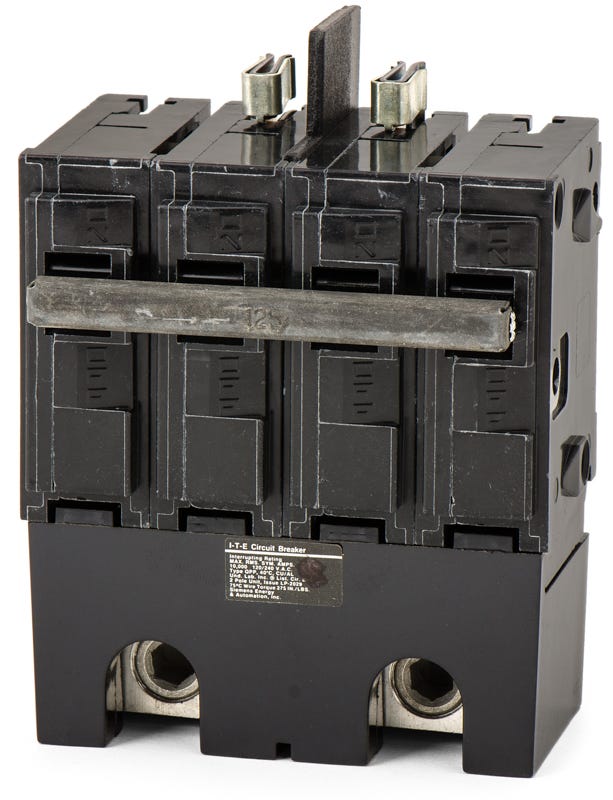 The Siemens Q2125B is a 2 Pole thermal magnetic molded case circuit breaker with a current rating of 125 Amps and a voltage rating of 240VAC. It has an interrupting rating of 10kAIC at 240V. The Q2125B has a plug-in connection type and includes long time and instantaneous trip functions.