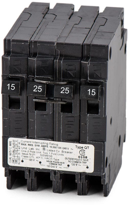 The Siemens Q21525CT is a quad thermal magnetic molded case circuit breaker with a current rating of 15, 25 Amps and a voltage rating of 120/240VAC. It has an interrupting rating of 10kAIC at 240V. The Q21525CT has a plug-in connection type and includes long time and instantaneous trip functions.