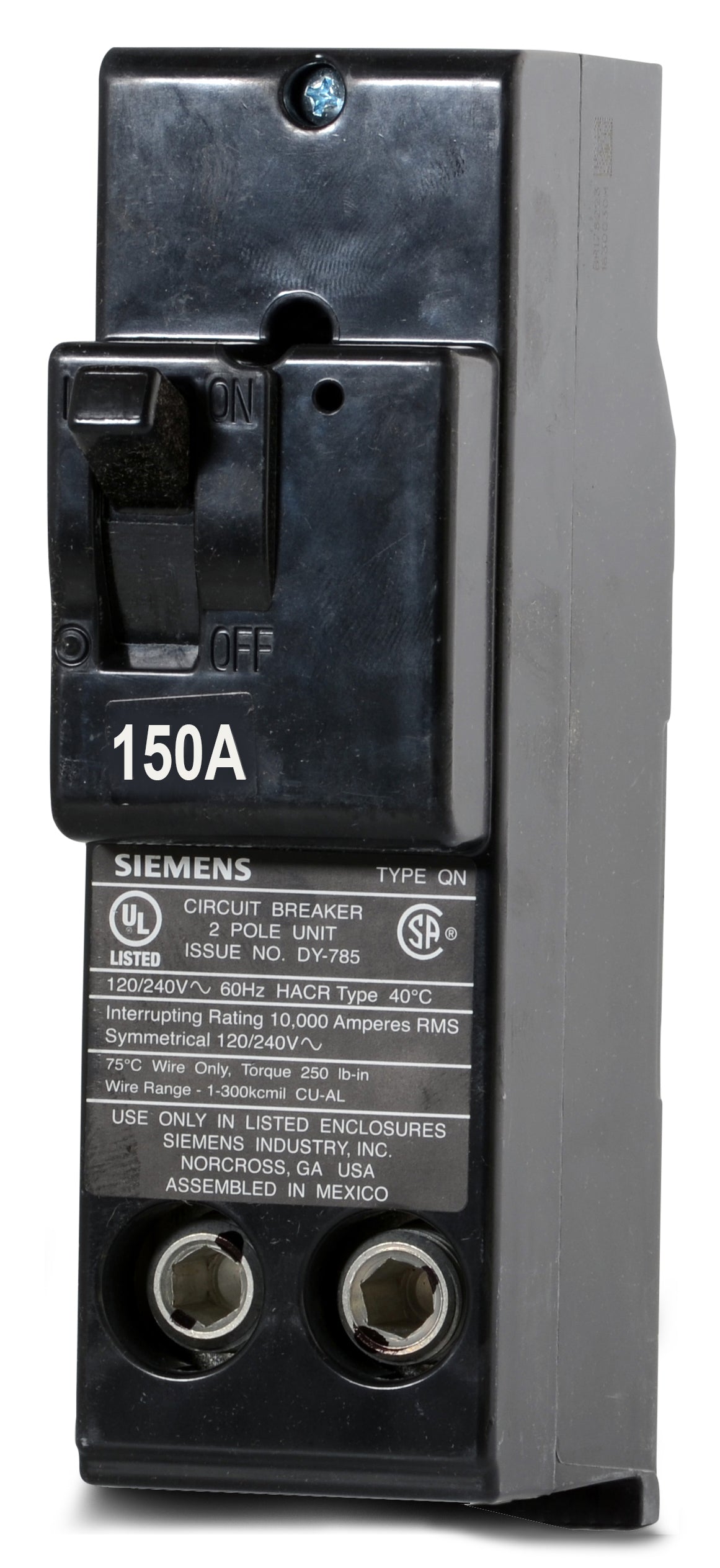 The Siemens QN2150R is a 2 Pole thermal magnetic molded case circuit breaker with a current rating of 150 Amps and a voltage rating of 120/240VAC. It has an interrupting rating of 10kAIC at 240V. The QN2150R has a plug-in connection type and includes long time and instantaneous trip functions.