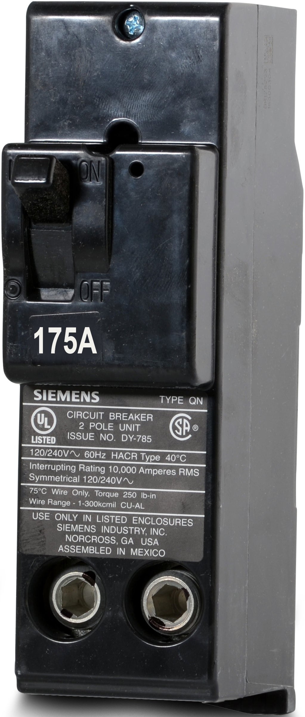 The Siemens QN2175 is a 2 Pole thermal magnetic molded case circuit breaker with a current rating of 175 Amps and a voltage rating of 120/240VAC. It has an interrupting rating of 10kAIC at 240V. The QN2175 has a plug-in connection type and includes long time and instantaneous trip functions.