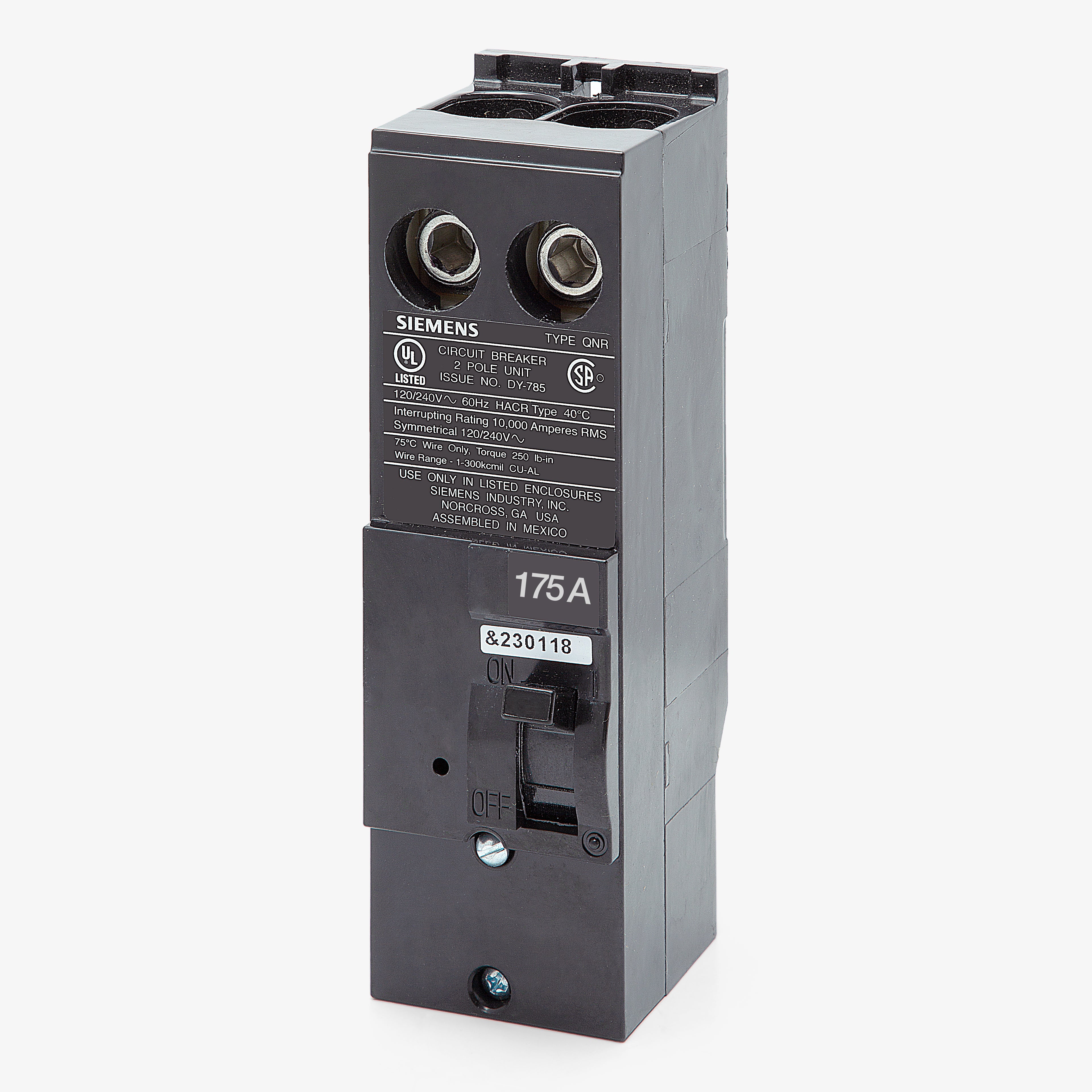 The QN2175RH is part of Siemens' Q Series, engineered for use as a main or branch breaker in compatible load centers and meter combinations. This 175-amp, 2-pole molded case circuit breaker utilizes a plug-on mounting style for straightforward installation. It serves as a direct replacement for the legacy MPD2175RH. Rated at 22 kAIC at 120/240VAC, this unit features a factory-installed reverse handle and common trip functionality to ensure comprehensive circuit protection.