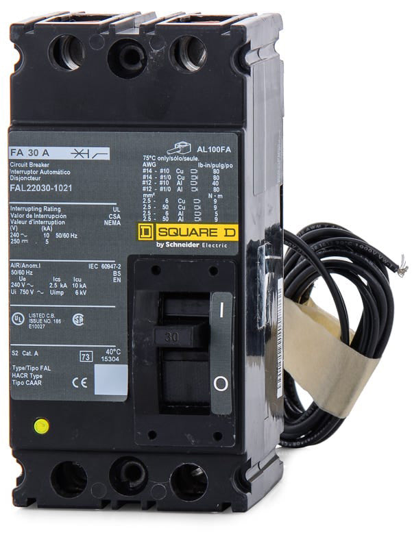 The Square D FAL22030-1021 is a 2 Pole thermal magnetic molded case circuit breaker with a current rating of 30 Amps and a voltage rating of 240VAC. It has an interrupting rating of 10kAIC@240V. The FAL22030-1021 has a unit mounting type and includes long time and instantaneous trip functions.