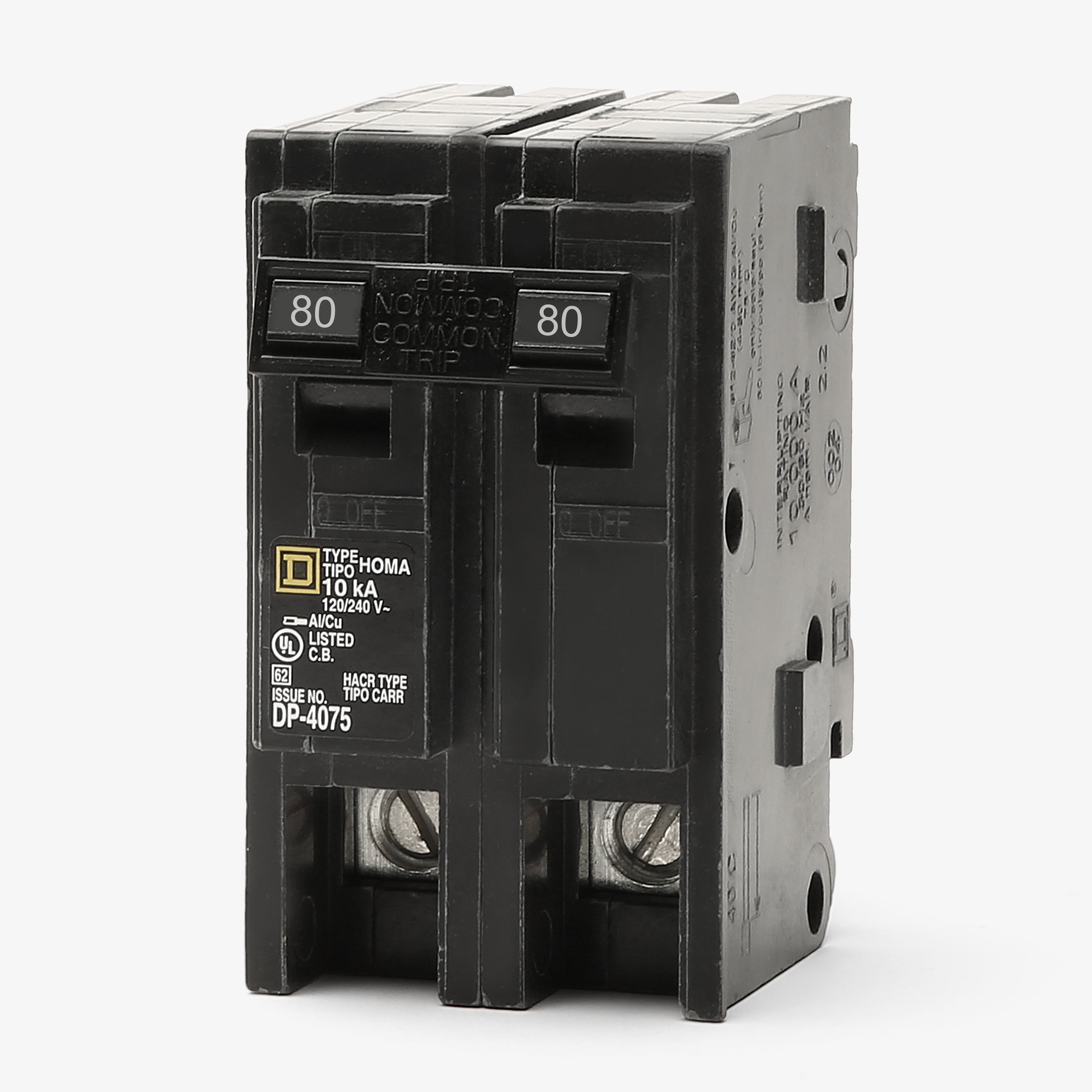 Built to support substantial residential loads, this 80A two-pole device is ideal for feeding subpanels or large electric heating appliances. Designed exclusively for Square D Homeline load centers, the plug-on format allows for quick integration into the busbar. It features spacious box lugs that accommodate 4 AWG to 2/0 AWG conductors. Rated for 10kAIC at 120/240VAC, it complies with standard residential fault current requirements and carries an HACR certification for dedicated HVAC circuits.