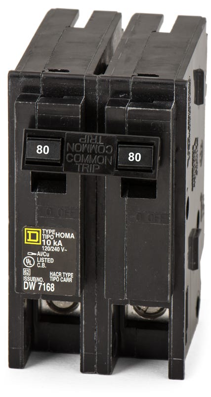 The Square D HOM280 is a 2 Pole thermal magnetic molded case circuit breaker with a current rating of 80 Amps and a voltage rating of 120/240VAC. It has an interrupting rating of 10kAIC at 240V. The HOM280 has a plug-in connection type and includes long time and instantaneous trip functions.