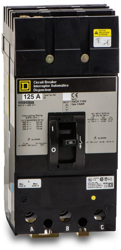 The Square D KH26125AB is a 2 Pole thermal magnetic molded case circuit breaker with a current rating of 125 Amps and a voltage rating of 600V. It has an interrupting rating of 35kAIC at 480V. The KH26125AB has a I-line style plug-in connection type and includes long time and instantaneous trip functions.