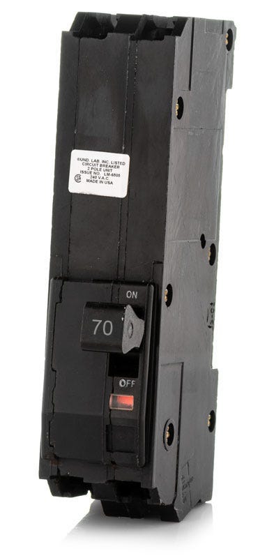 The Square D Q1B270 is a 2 Pole thermal magnetic molded case circuit breaker with a current rating of 70 Amps and a voltage rating of 240VAC. It has an interrupting rating of 10kAIC at 240V. The Q1B270 has a bolt-on connection type and includes long time and instantaneous trip functions.