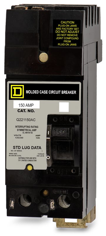 The Square D Q221150AC is a 2 Pole thermal magnetic molded case circuit breaker with a current rating of 150 Amps and a voltage rating of 240V. It has an interrupting rating of 10kAIC at 240V. The Q221150AC has an I-Line style plug-in connection type and includes LI - long-time and instantaneous trip functions.