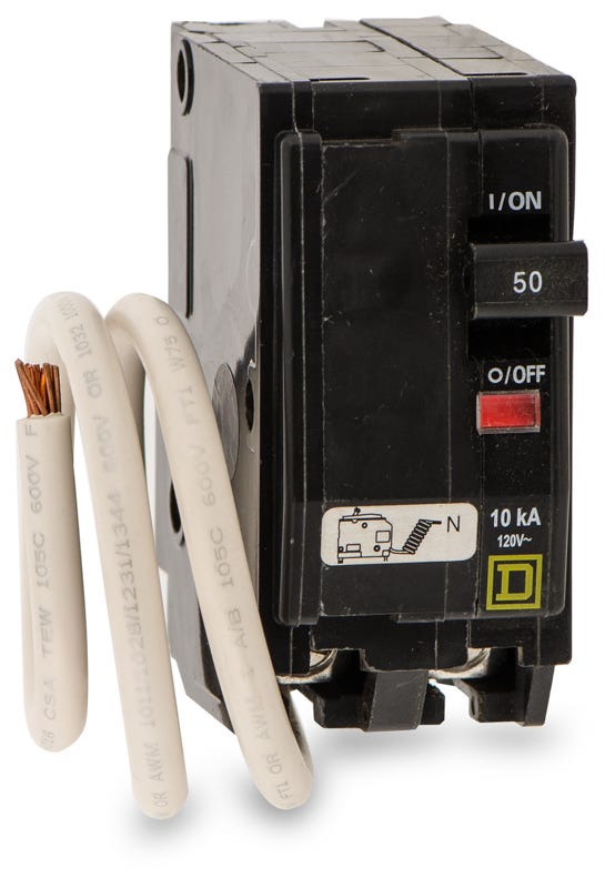 The Square D QO250SWN is a 2 Pole thermal magnetic molded case circuit breaker with a current rating of 50 Amps and a voltage rating of 120/240VAC. It has an interrupting rating of 10kAIC at 120VAC. The QO250SWN has a plug-in connection type and includes LI - long-time and instantaneous trip functions.