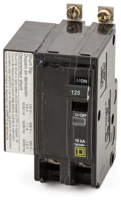 The Square D QOB2125-1021 is a 2 Pole thermal magnetic molded case circuit breaker with a current rating of 125 Amps and a voltage rating of 120/240VAC. It has an interrupting rating of 10kAIC at 120/240VAC. The QOB2125-1021 has a bolt-on connection type and includes LI - long-time and instantaneous trip functions.