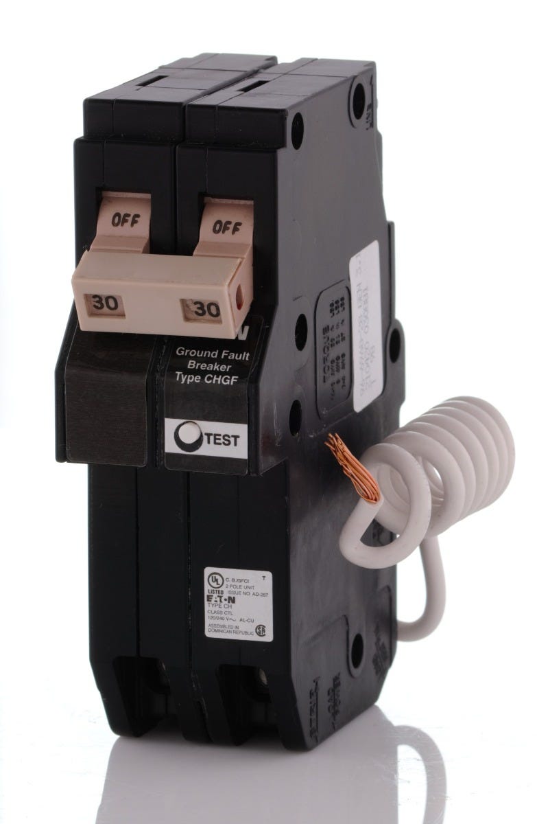 Square D QOB series double pole single phase 30 ampere bolt-on molded case ground fault circuit breaker with maximum voltage rating of 240V tripping method thermal magnetic and standard interrupting rating of 10 kiloampere at 240V with ground fault circuit interrupter suitable for QOB series load centers.