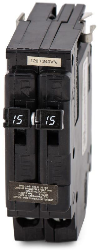The Crouse Hinds TBA215 is a 2 Pole thermal magnetic molded case circuit breaker with a current rating of 15 Amps and a voltage rating of 240V. It has a plug-in connection type.