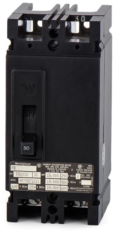 The Westinghouse FB2030 is a 2 Pole thermal magnetic molded case circuit breaker with a current rating of 30 Amps and a voltage rating of 600VAC. It has an interrupting rating of 14kAIC at 480V. The FB2030 has a bolt-on connection type and includes long time and instantaneous trip functions.