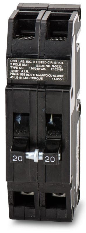 The Zinsco QC20 is a 2 Pole thermal magnetic molded case circuit breaker with a current rating of 20 Amps and a voltage rating of 120/240VAC. It has an interrupting rating of 10kAIC at 240V. The QC20 has a plug-in connection type and includes long time and instantaneous trip functions.