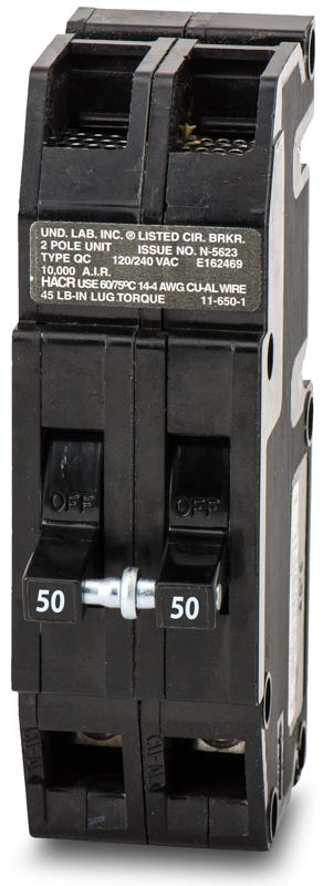 The Zinsco QC250 is a 2 Pole thermal magnetic molded case circuit breaker with a current rating of 50 Amps and a voltage rating of 240V. It has an interrupting rating of 10kAIC at 240V. The QC250 has a feed-thru connection type and includes long time and instantaneous trip functions.