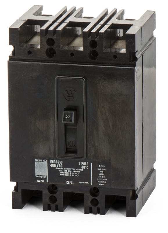 Westinghouse molded case circuit breaker Its Compact and Easy to Install Three Pole Three Phase E Frame Long Time and Instantaneous Functions Circuit Breaker. Circuit Breaker Voltage Rating of 480 V and 50 ampere With Built in Bolt On Connection Thermal Magnetic Protection Molded Case Circuit Breakers.