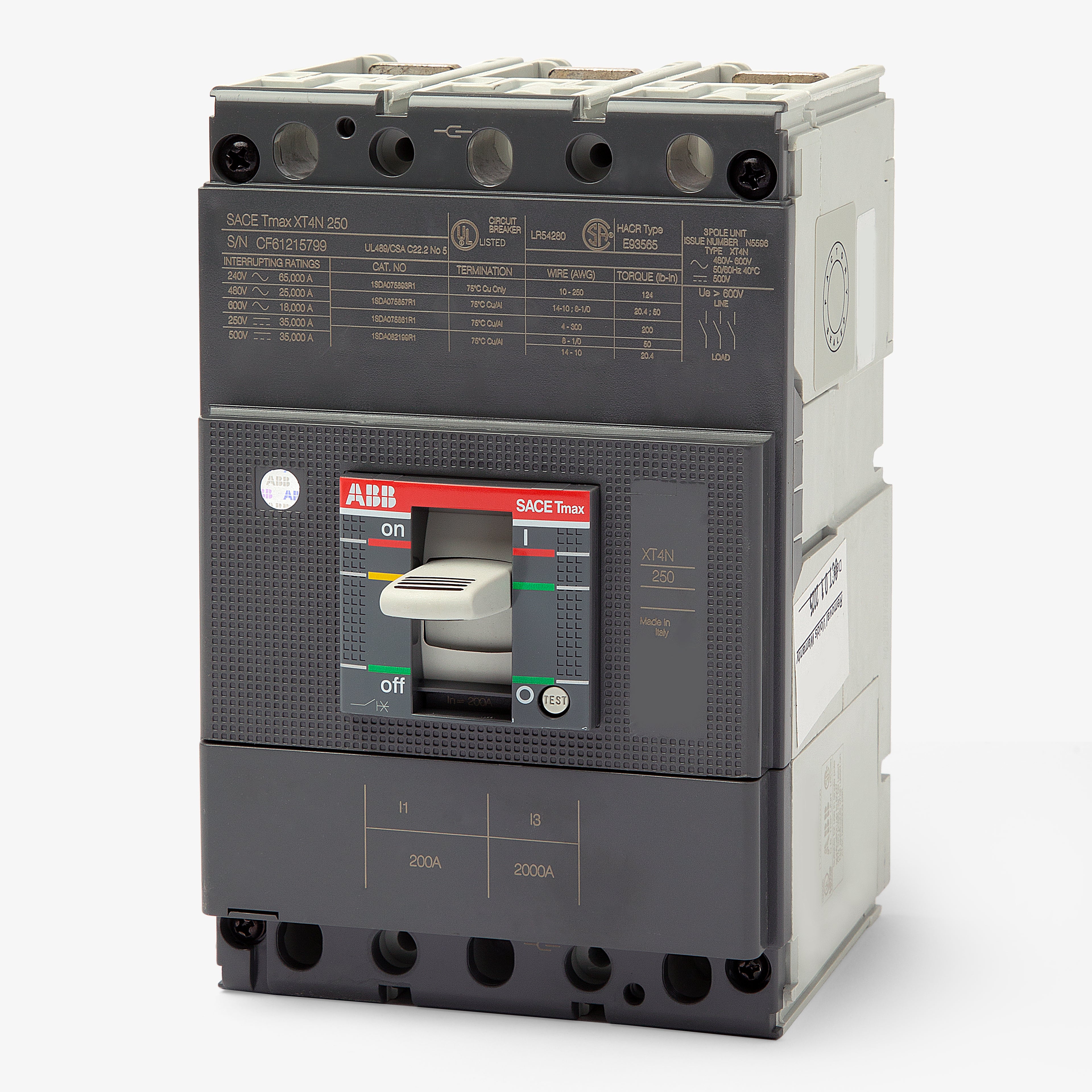 The ABB XT4NU3200AFJ000XXX is a 3 Pole thermal magnetic molded case circuit breaker with a current rating of 200 Amps and a voltage rating of 600VAC. It has an interrupting rating of 25kAIC at 480V. The XT4NU3200AFJ000XXX has a panel mounting type.