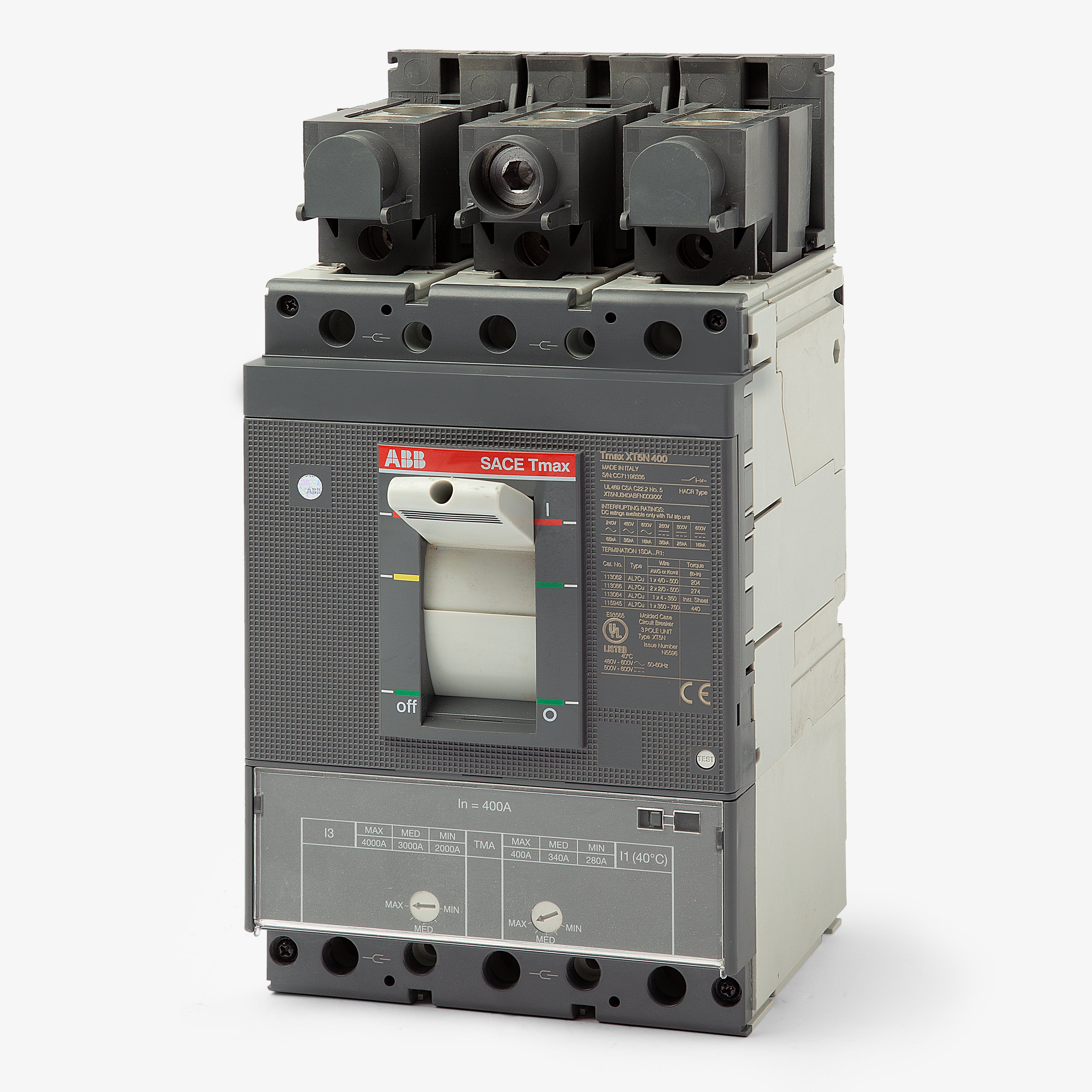 The ABB XT5NU340ABFN000XXX is a 3 Pole molded case circuit breaker with a current rating of 400 Amps and a voltage rating of 600VAC. It has an interrupting rating of 35kAIC.