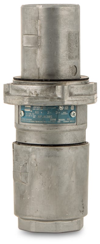 Crouse Hinds APJ three pole 60 ampere industrial arktite plug pin & sleeve with maximum voltage rating of 600/250V material cast aluminum grounding style 2 shell extra pole features corrosion resistant dirt tight dust tight moisture resistant.