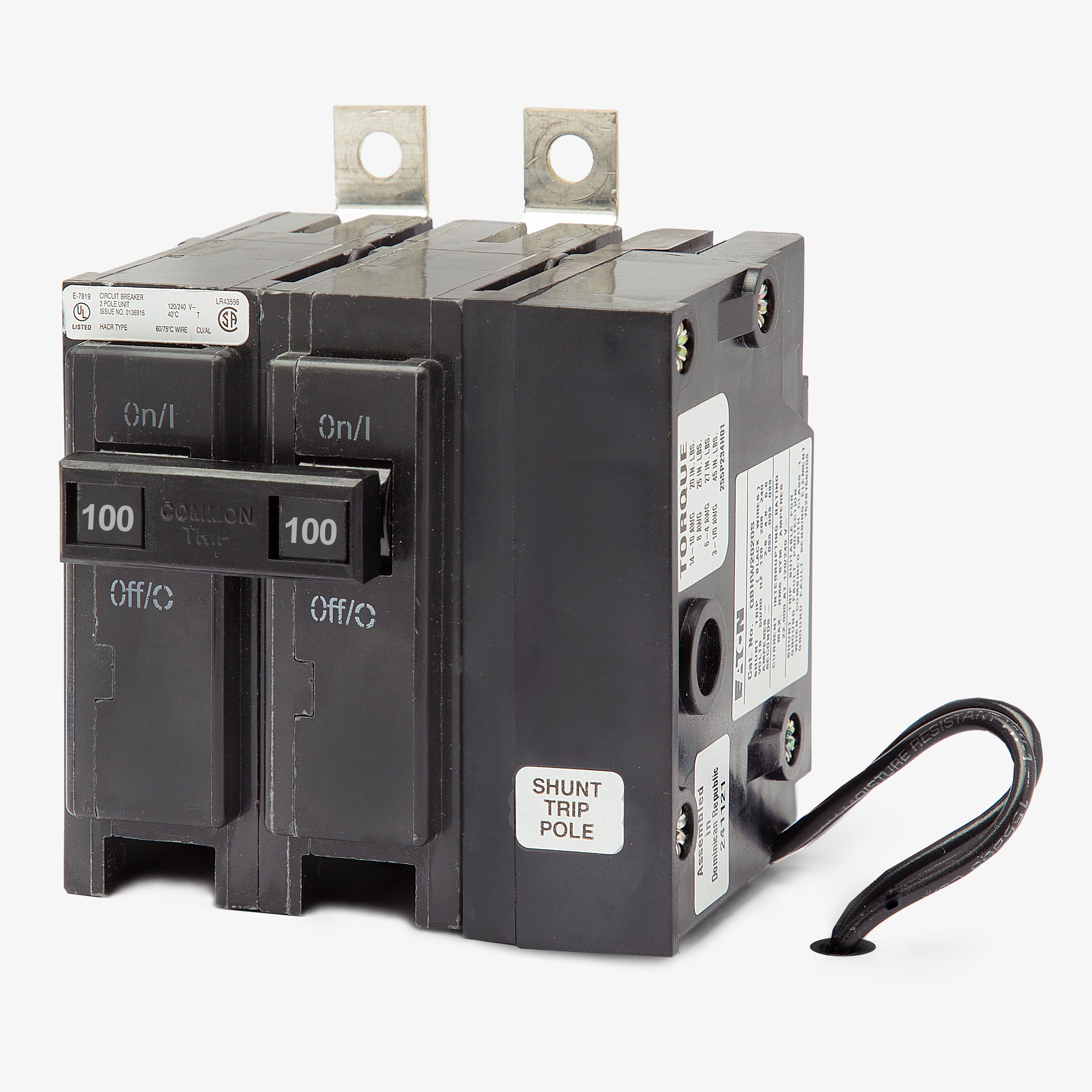 Cutler Hammer/Eaton 2 pole circuit breaker features a thermal magnetic molded case for extra protection. The circuit breaker has a current rating of 100 amps with a voltage rating of 240 v. It has an interrupt rating of 22 kAIC.