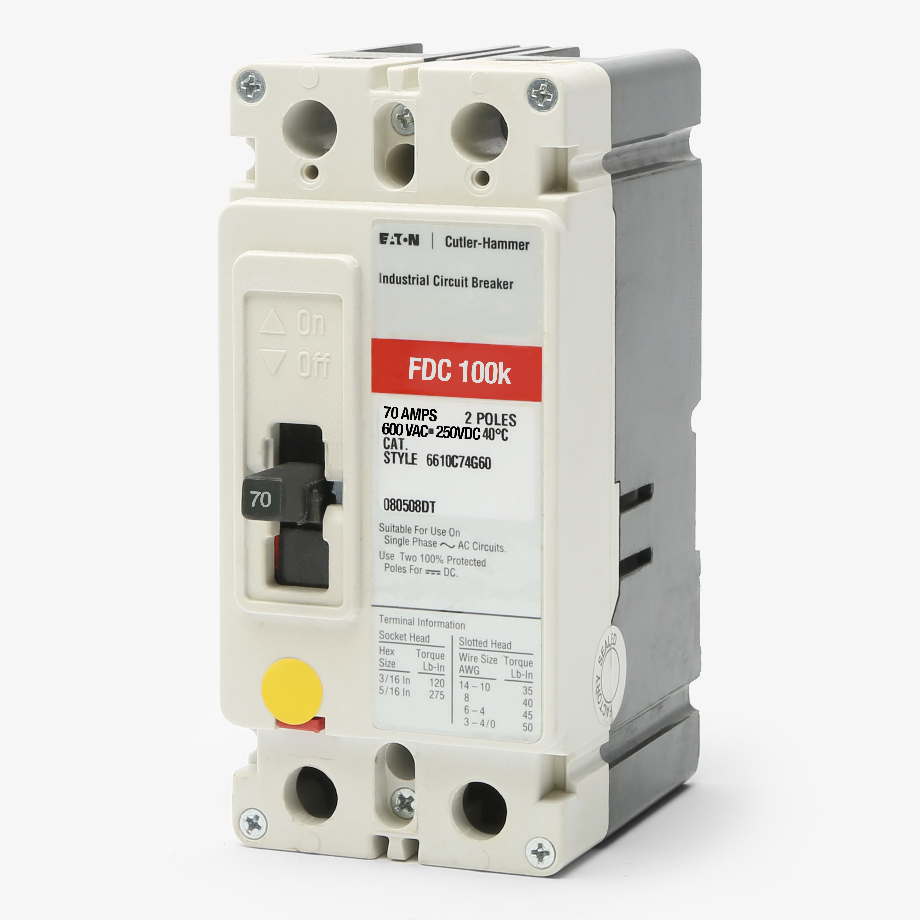 The Eaton FDC2070 is a 2 Pole thermal magnetic molded case circuit breaker with a current rating of 70 Amps and a voltage rating of 600V. It has an interrupting rating of 100kAIC at 480VAC, 200kAIC at 240VAC. The FDC2070 has a panel mounting type and includes long time and instantaneous trip functions.