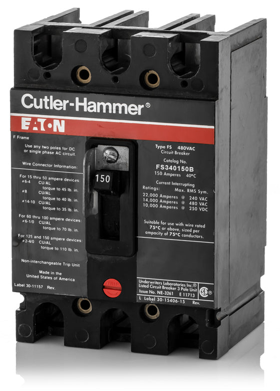 The Eaton FS340150B is a 3 Pole thermal magnetic molded case circuit breaker with a current rating of 150 Amps and a voltage rating of 480VAC. It has an interrupting rating of 14kAIC@480V. The FS340150B has a feed-thru connection type and includes long time and instantaneous trip functions.