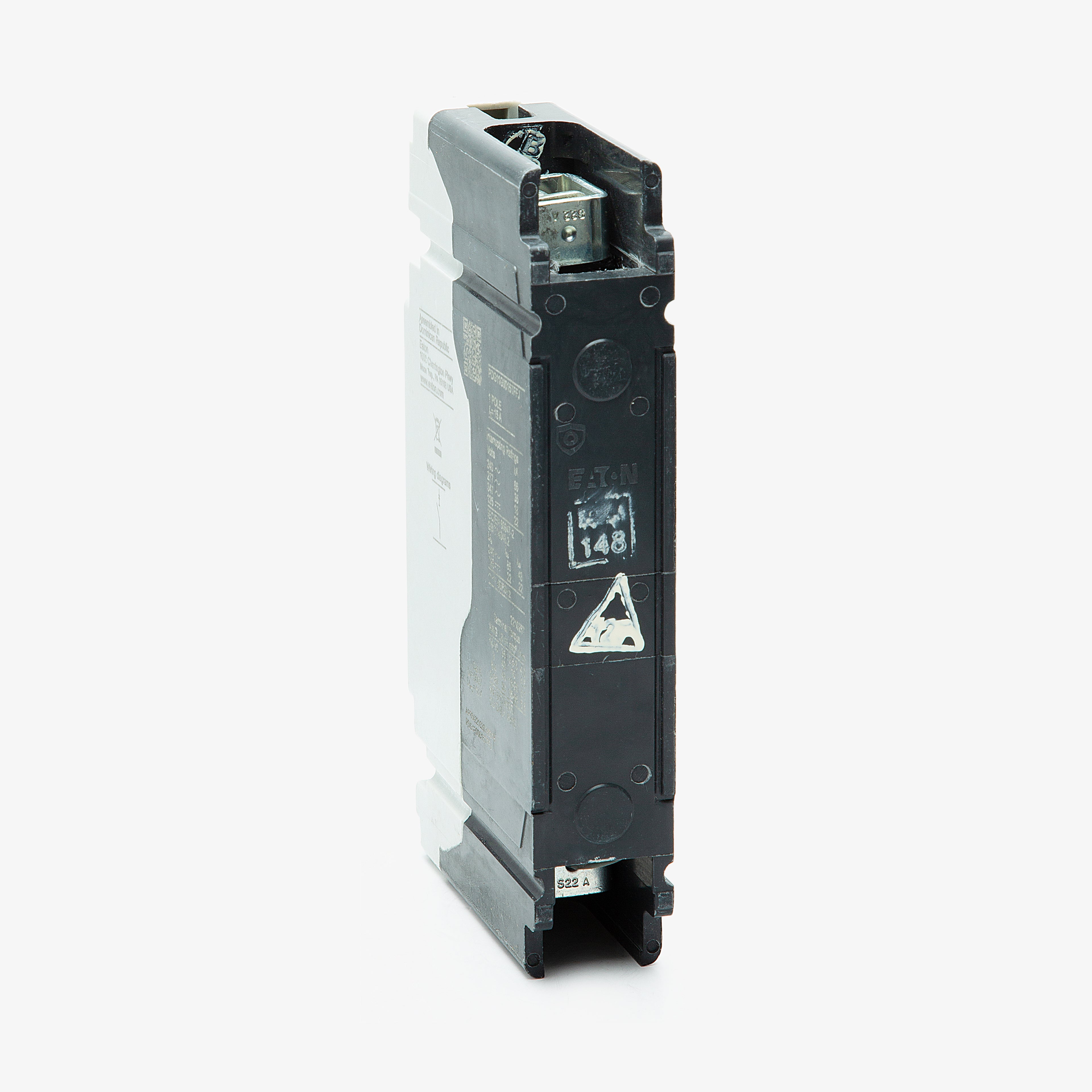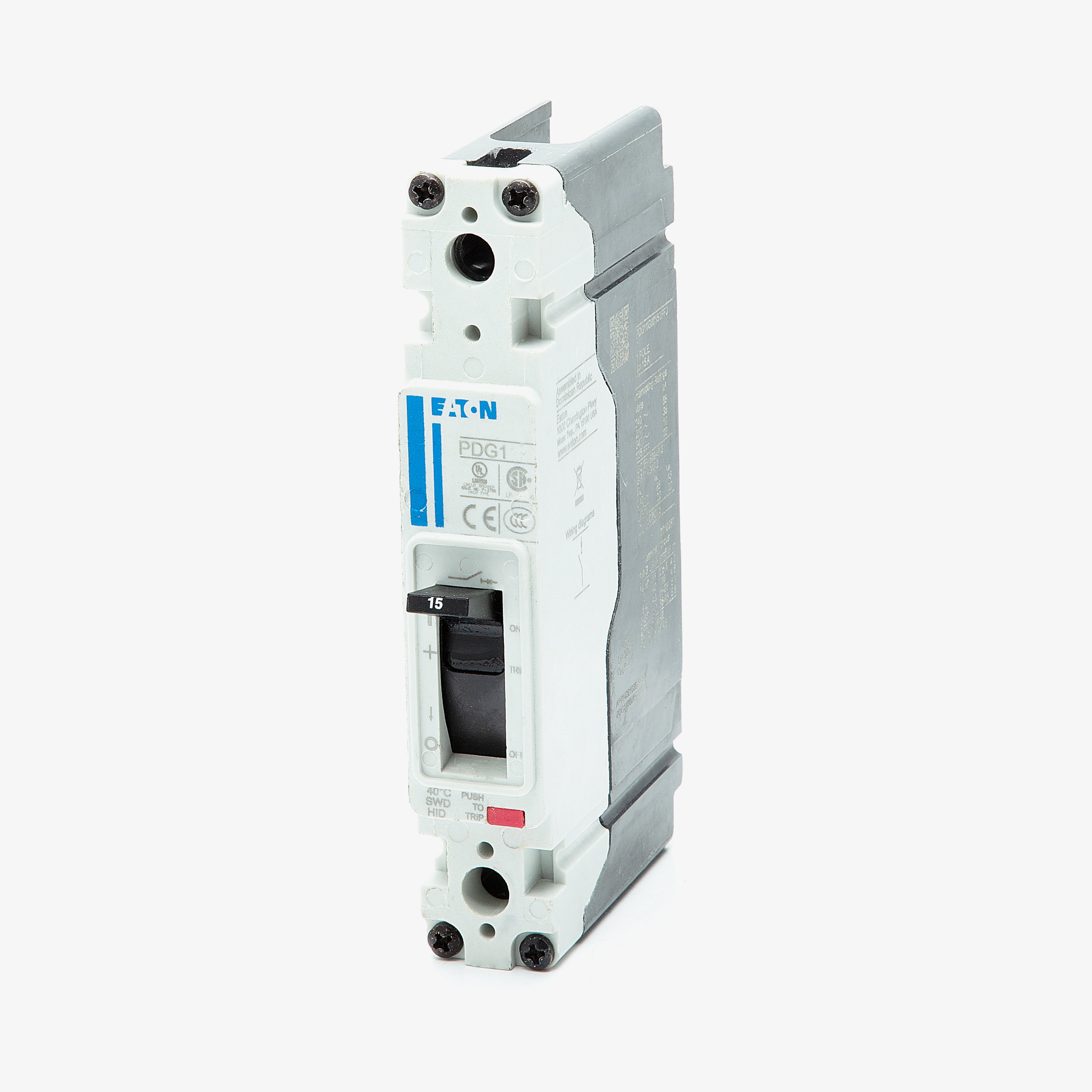 The Eaton PDG11G0015TFFJ is a 1 Pole thermal magnetic molded case circuit breaker with a current rating of 15 Amps and a voltage rating of 600VAC, 250VDC. It has an interrupting rating of 35kAIC at 480VAC. The PDG11G0015TFFJ has a feed-thru connection type and includes long time and instantaneous trip functions.