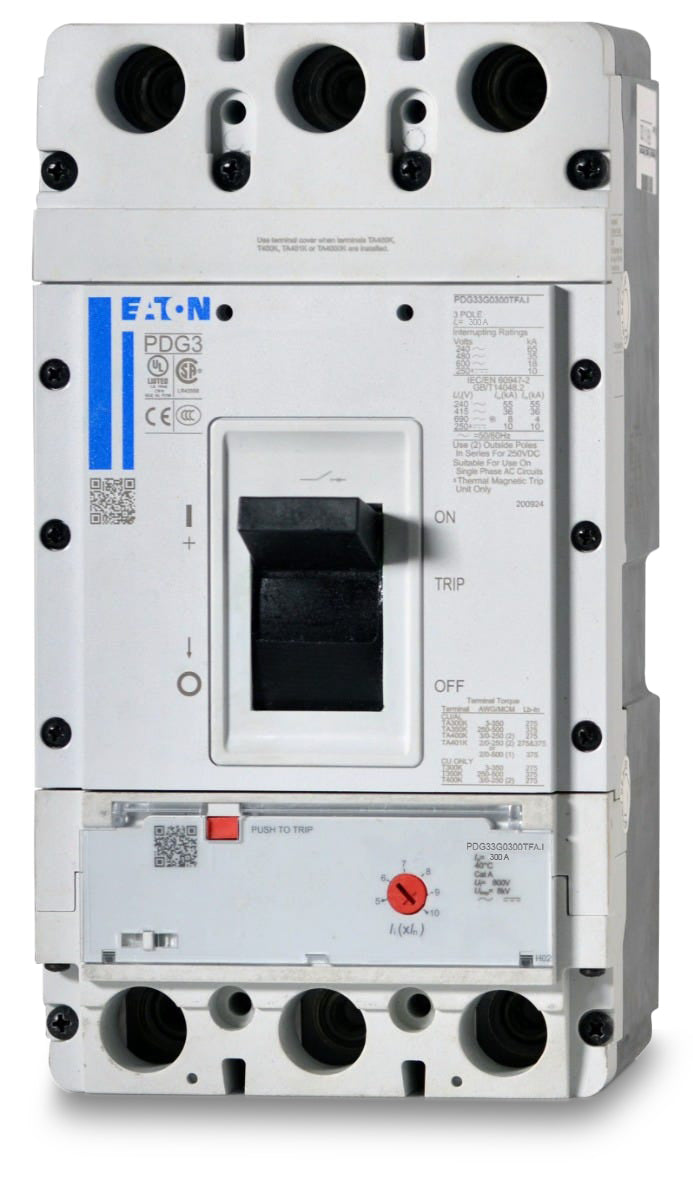 The Eaton PDG33G0300TFAJ is a 3 Pole thermal magnetic molded case circuit breaker with a current rating of 300 Amps and a voltage rating of 600VAC, 250VDC. It has an interrupting rating of 35kAIC at 480VAC. The PDG33G0300TFAJ has a feed-thru connection type and includes long time and instantaneous trip functions.
